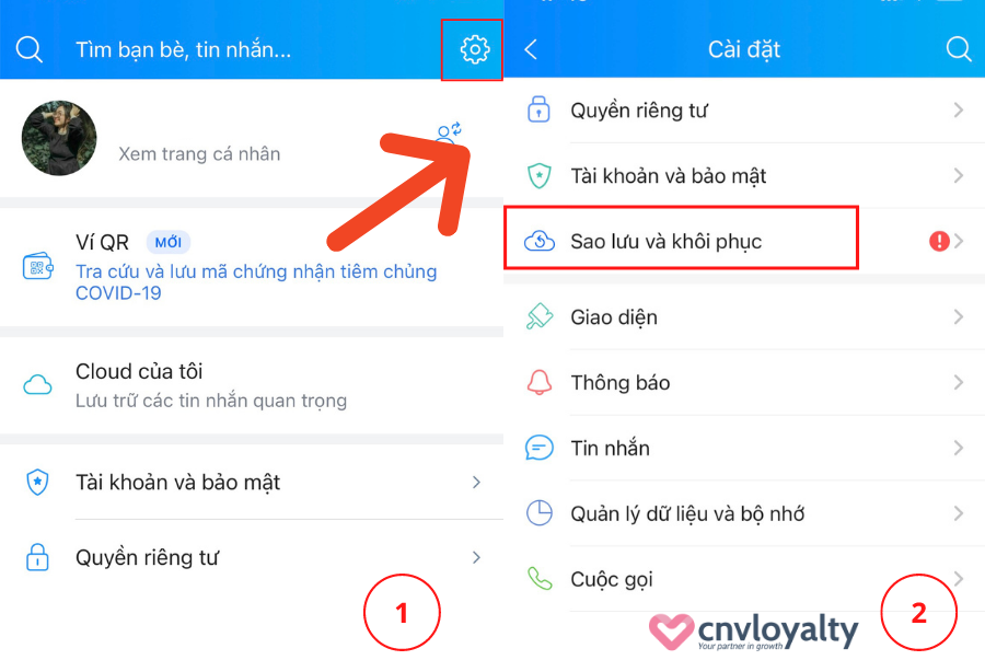 Bước 2: Tiếp tục vào Cài đặt (hình răng cưa) góc phải phía trên > Chọn Sao lưu và khôi phục.